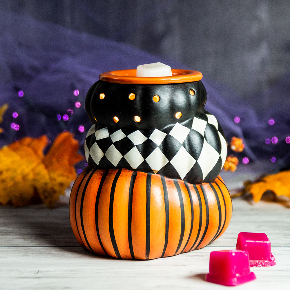 Celebrate Halloween with a flare! The festive bright colors and designs on these stacked pumpkins are sure to stand out. Perfect for adding warmth and fragrance to your space. Sit back, relax, and enjoy. Wax sold separately.